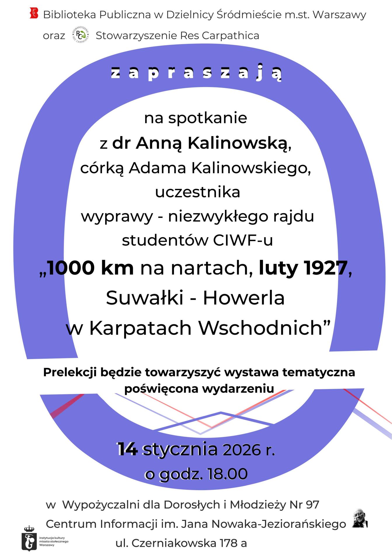 Biblioteka Publiczna w Dzielnicy Śródmieście m.st. Warszawy oraz Stowarzyszenie Res Carpathica zapraszają na spotkanie z dr Anną Kalinowską, córką Adama Kalinowskiego, uczestnika wyprawy - niezwykłego rajdu studentów CIWF-u "1000 km na nartach, luty 1927, Suwałki - Howerla w Karpatach Wschodnich".