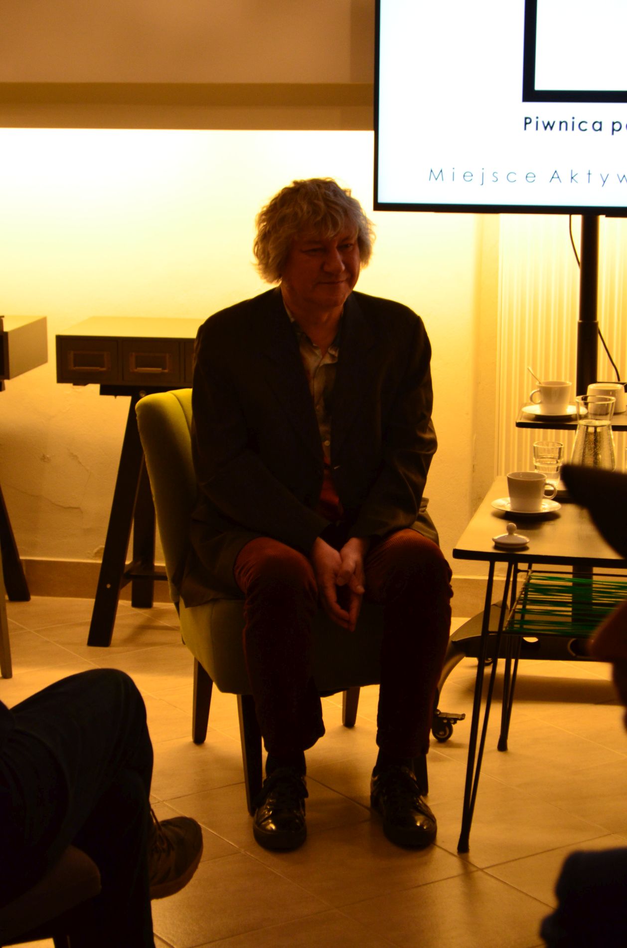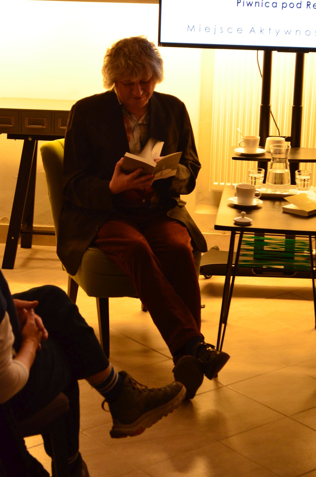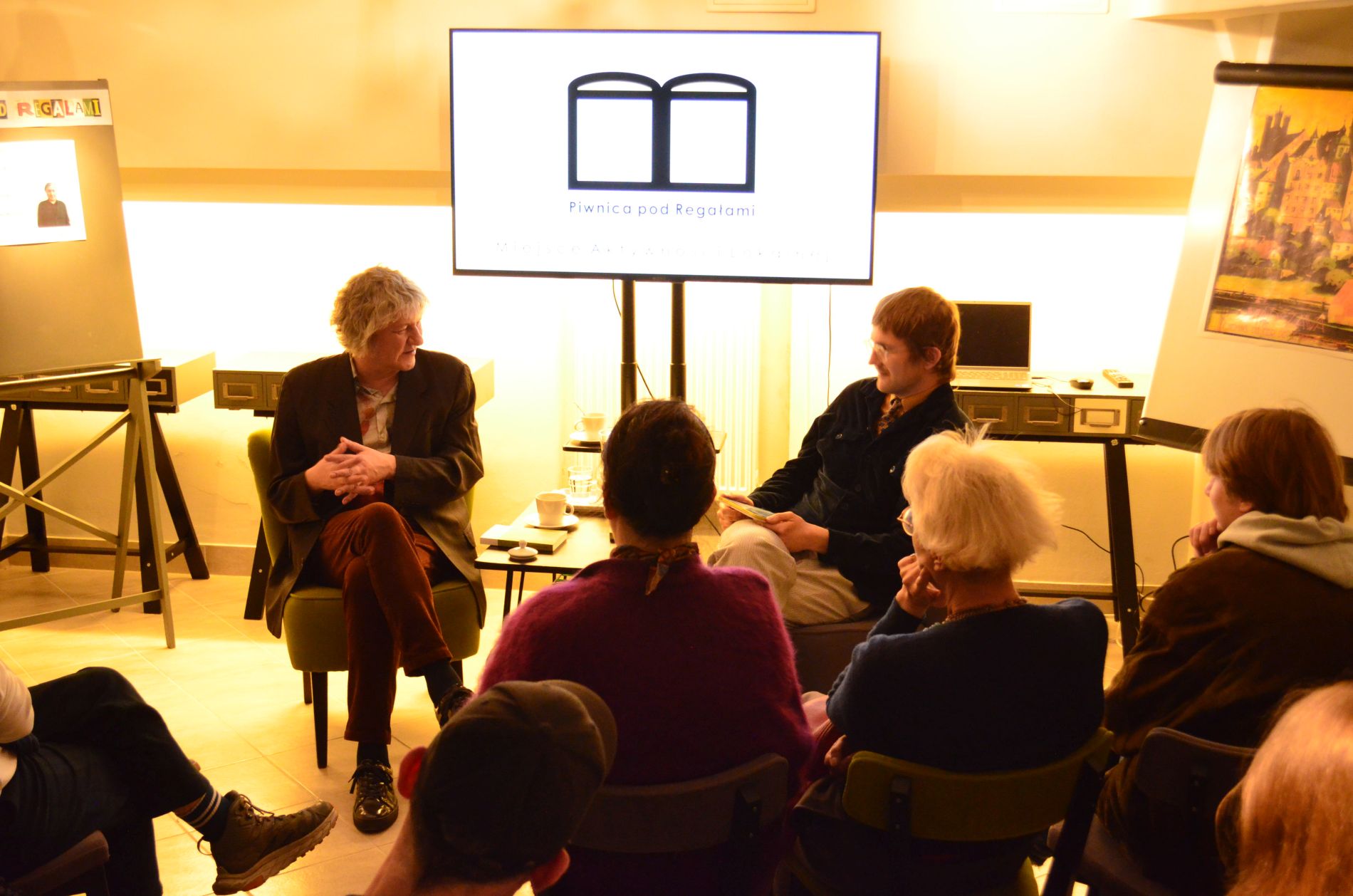 Słuchacze wieczoru z Adamem Wiedemannem licznie wypełnili "Piwnicę pod Regałami". Zapewne, motywowani także ciekawością, jak autor odnajdzie się w roli gościa PIWNICY POETÓW. Wszak był tu od zawsze obecny jako prowadzący. I rzeczywiście, było nietypowo. Adam Wiedemann skupił się na swojej ostatnio wydanej książce "Jedzmy zwracajmy", a naprowadzany pytaniami Jakuba Nowackiego odsłaniał to, co nas czytelników zawsze pociąga – swoją prawdziwą naturę. Nowacki uważa, że Wiedemann "...pozostaje wierny jednej tylko sprawie: autonomii sztuki, która jest dla niego przestrzenią prawdziwej, radykalnej wolności...". Trzeba mu przyznać rację, bo wieczór był pełen wzruszeń, zadumy, prawdziwego śmiechu i naturalności, do których lgniemy spotykając prawdziwą szczerość.