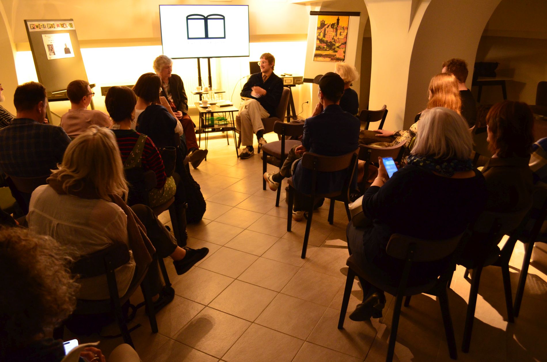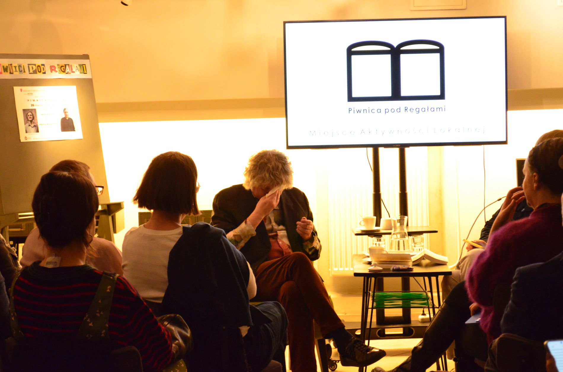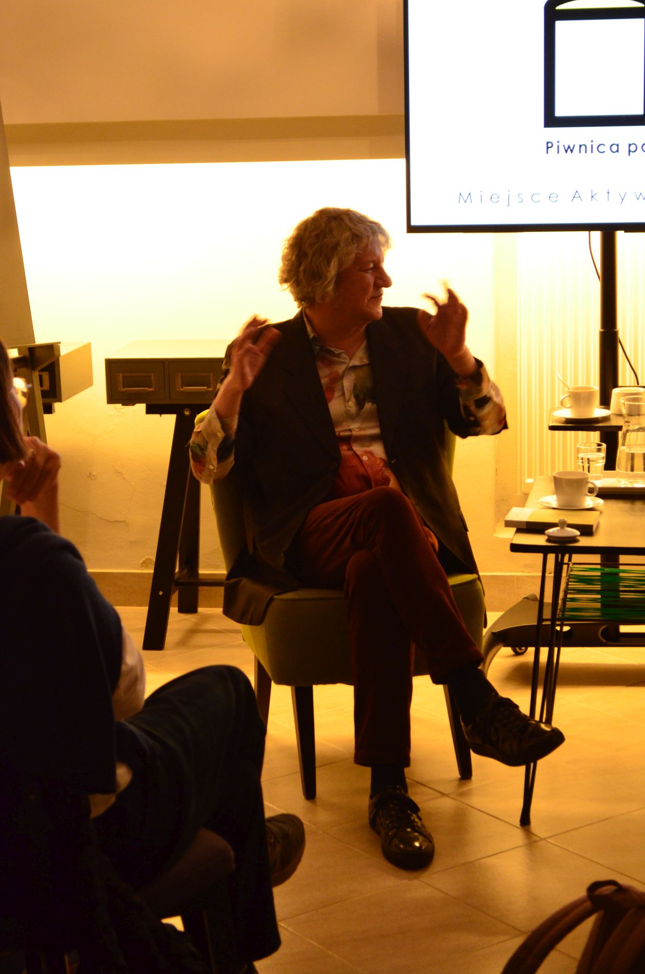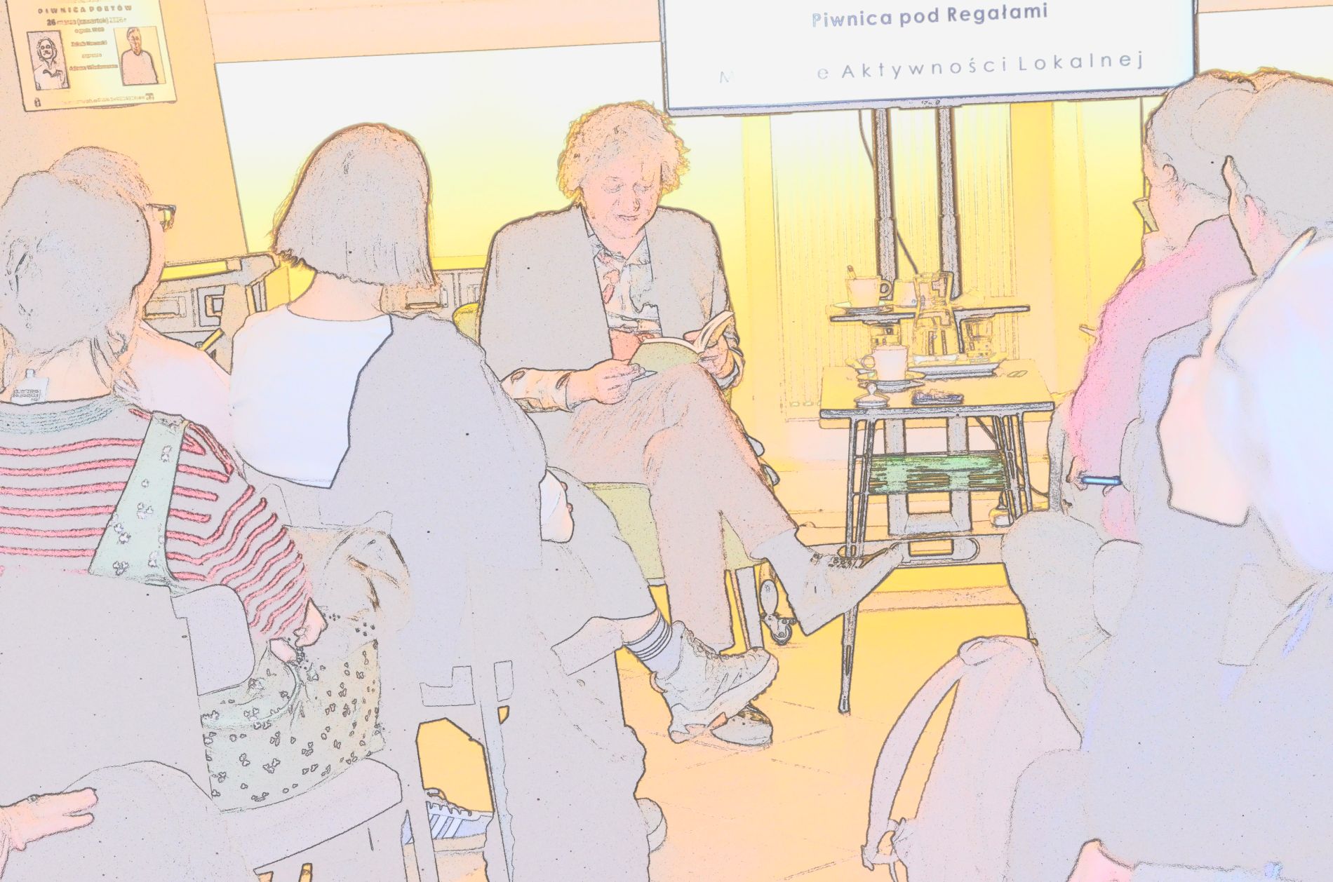 Słuchacze wieczoru z Adamem Wiedemannem licznie wypełnili "Piwnicę pod Regałami". Zapewne, motywowani także ciekawością, jak autor odnajdzie się w roli gościa PIWNICY POETÓW. Wszak był tu od zawsze obecny jako prowadzący. I rzeczywiście, było nietypowo. Adam Wiedemann skupił się na swojej ostatnio wydanej książce "Jedzmy zwracajmy", a naprowadzany pytaniami Jakuba Nowackiego odsłaniał to, co nas czytelników zawsze pociąga – swoją prawdziwą naturę. Nowacki uważa, że Wiedemann "...pozostaje wierny jednej tylko sprawie: autonomii sztuki, która jest dla niego przestrzenią prawdziwej, radykalnej wolności...". Trzeba mu przyznać rację, bo wieczór był pełen wzruszeń, zadumy, prawdziwego śmiechu i naturalności, do których lgniemy spotykając prawdziwą szczerość.