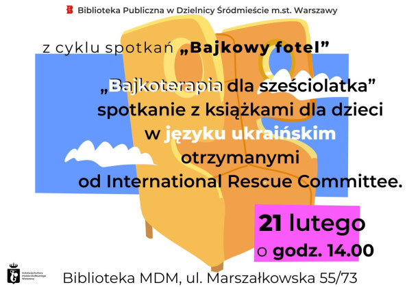 W dniu 21 lutego o godzinie 14:00 Wypożyczalnia dla Dorosłych i Młodzieży nr 7 z Oddziałem dla Dzieci (Biblioteka MDM) przy ul. Marszałkowskiej 55/73, zaprasza dzieci na spotkanie z cyklu "Bajkowy fotel". Będzie to "Bajkoterapia dla sześciolatka", czyli spotkanie z książkami dla dzieci w języku ukraińskim otrzymanymi od International Rescue Committee.