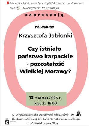 Biblioteka Publiczna w Dzielnicy Śródmieście m.st. Warszawy oraz Stowarzyszenie Res Carpathica zapraszają na wykład Krzysztofa Jabłonki pt.: "Czy istniało państwo karpackie - pozostałość Wielkiej Morawy?".