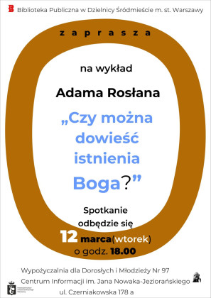 Biblioteka Publiczna w Dzielnicy Śródmieście m.st. Warszawy zaprasza na wykład Adama Rosłana pt. "Czy można dowieść istnienia Boga?".