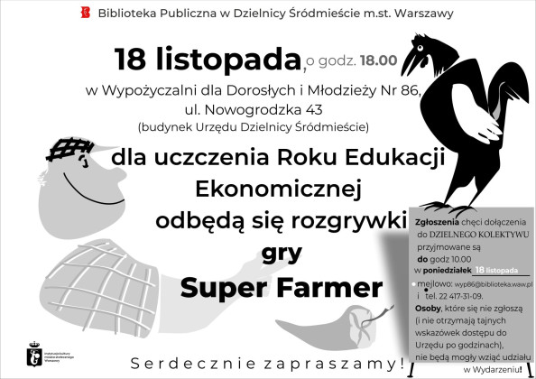 Spontaniczna Grupa DZIELNY KOLEKTYW zaprasza w poniedziałek, 18 listopada o godzinie 18:00 do Wypożyczalni dla Dorosłych i Młodzieży Nr 86, ul. Nowogrodzka 43 (budynek Urzędu Dzielnicy Śródmieście) na spotkanie dla uczczenia Roku Edukacji Ekonomicznej. Tego dnia odbędą się rozgrywki gry Super Farmer.