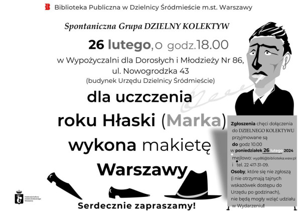 Spontaniczna Grupa DZIELNY KOLEKTYW zaprasza w poniedziałek, 26 lutego o godz. 18:00 do Wypożyczalni dla Dorosłych i Młodzieży Nr 86, ul. Nowogrodzka 43 (budynek Urzędu Dzielnicy Śródmieście) na spotkanie dla uczczenia roku Marka Hłaski. Wykonamy makietę Warszawy.