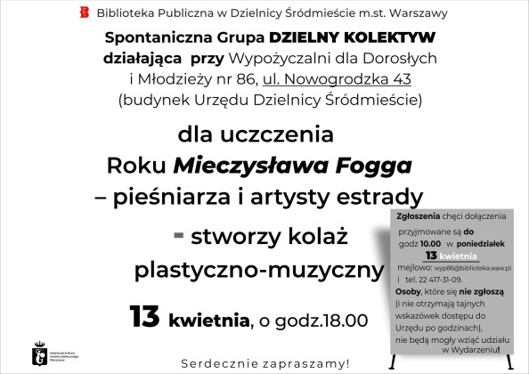 Spontaniczna Grupa DZIELNY KOLEKTYW zaprasza w poniedziałek, 13 kwietnia o godzinie 18:00 do Wypożyczalni dla Dorosłych i Młodzieży Nr 86, ul. Nowogrodzka 43 (budynek Urzędu Dzielnicy Śródmieście) na spotkanie dla uczczenia Roku Mieczysława Fogga - pieśniarza i artysty estrady. Stworzymy kolaż plastyczno-muzyczny.