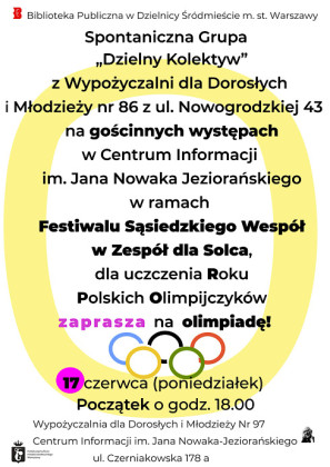 Spontaniczna Grupa Dzielny Kolektyw z Wypożyczalni Nr 86 z ul. Nowogrodzkiej 43 pojawi się na gościnnych występach w Centrum Informacji im. Jana Nowaka-Jeziorańskiego. W ramach Festiwalu Sąsiedzkiego Wespół w Zespół dla Solca i Powiśla, zapraszamy na olimpiadę, dla uczczenia Roku Polskich Olimpijczyków.