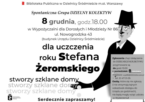 Spontaniczna Grupa DZIELNY KOLEKTYW zaprasza w poniedziałek, 8 grudnia o godzinie 18:00 do Wypożyczalni dla Dorosłych i Młodzieży Nr 86, ul. Nowogrodzka 43 (budynek Urzędu Dzielnicy Śródmieście) na spotkanie dla uczczenia Roku Stefana Żeromskiego. Stworzymy szklane domy.