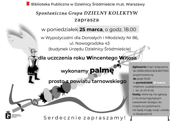 Spontaniczna Grupa DZIELNY KOLEKTYW zaprasza w poniedziałek, 25 marca o godzinie 18:00 do Wypożyczalni dla Dorosłych i Młodzieży Nr 86, ul. Nowogrodzka 43 (budynek Urzędu Dzielnicy Śródmieście) na spotkanie dla uczczenia roku Wincenta Witosa. Wykonamy palmę prosto z powiatu tarnowskiego.
