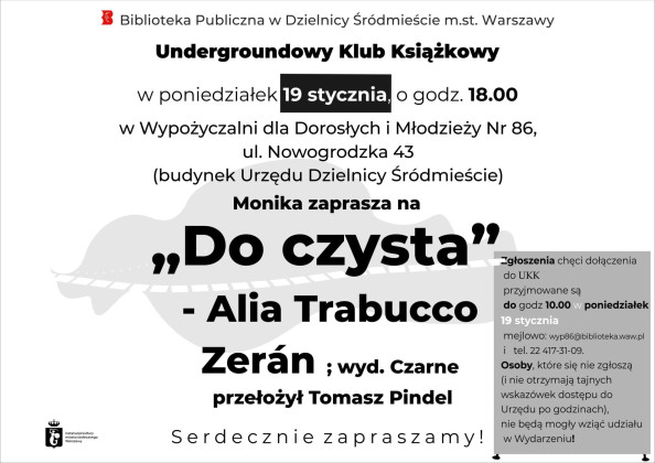 Wypożyczalnia dla Dorosłych i Młodzieży Nr 86, ul. Nowogrodzka 43 (budynek Urzędu Dzielnicy Śródmieście) zaprasza w poniedziałek 19 stycznia o godzinie 18:00 na spotkanie Undergroundowego Klubu Książkowego. Porozmawiamy o książce "Do czysta" - Alia Trabucco Zerán.