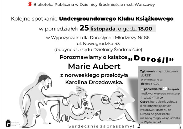 Wypożyczalnia dla Dorosłych i Młodzieży Nr 86, ul. Nowogrodzka 43 (budynek Urzędu Dzielnicy Śródmieście) zaprasza w poniedziałek 25 listopada o godzinie 18:00 na spotkanie Undergroundowego Klubu Książkowego. Porozmawiamy o książce "Dorośli" Marie Aubert.