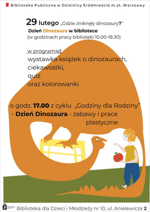 Biblioteka dla Dzieci i Młodzieży Nr 10, ul. Anielewicza 2 zaprasza dzieci dnia 29 lutego w godzinach 10:00-18:30 na Dzień Dinozaura w bibliotece. W programie wystawy książek o dinozaurach, ciekawostki, quiz i kolorowanki.
