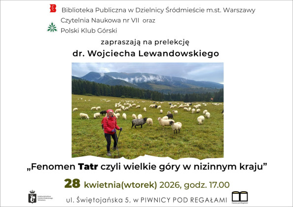 Czytelnia Naukowa Nr VII oraz Polski Klub Górski zapraszają 28 kwietnia o godzinie 17:00 na prelekcję dr. Wojciecha Lewandowskiego pt. "Fenomen Tatr czyli wielkie góry w nizinnym kraju". Spotkamy się w Piwnicy pod Regałami przy ul. Świętojańskiej 5.