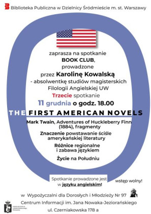 Na spotkaniu The First American Novels 11 grudnia o godzinie 18:00 będą omawiane fragmenty książki Marka Twaina "The Adventures of Huckleberry Finn"- rozdziały: 1-8, 17-22 i 29-35.