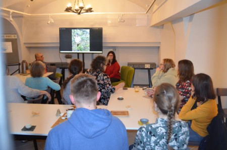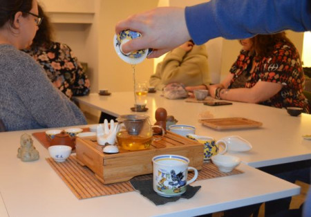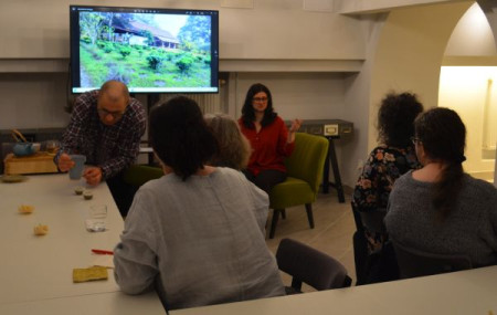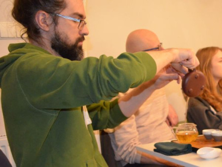 Czwartkowe spotkanie "Gdzie niebo łączy się z ziemią – herbaciana podróż do Tajlandii" poprowadziła pasjonatka tego napoju - Małgorzata Grunduls. Zabrała ona gości "Piwnicy pod Regałami" w osobistą podróż przez cztery azjatyckie plantacje krzewów herbaty. Opowieściom z wyprawy towarzyszyły fotografie z niezwykłych spotkań i miejsc. Zdjęcia cieszyły oczy, a podniebienia rozgrzewały dwa gatunki świeżo parzonego ulunga z gór dawnego królestwa Syjamu. Aromat i smak herbaty podawanej w delikatnych czarkach, kandyzowany imbir... Autorce i "Towarzystwu Pełnej Czarki" za wiele doznań cieszących zmysły serdecznie dziękujemy.