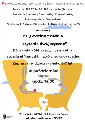 Fundacja Lire et faire lire Ardèche (Francja), Pracownia Literatury Francuskiej i Frankofońskiej Uniwersytetu w Białymstoku, Biblioteka MDM oraz Biblioteka dla Dzieci i Młodzieży Nr 38 zapraszają na "Godzinę z baśnią - czytanie dwujęzyczne". Z Biblioteki MDM połączymy się on-line z uczniami francuskich szkół z regionu Ardèche.