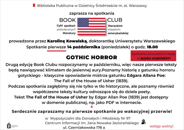 Pierwsze spotkanie już 14 października o godzinie 18:00 w Wypożyczalni dla Dorosłych i Młodzieży Nr 97 - Centrum Informacji im. Jana Nowaka-Jeziorańskiego (ul. Czerniakowska 178a). Poznamy historię z gatunku horroru gotyckiego - klasyczne opowiadanie mistrza gatunku Edgara Allana Poe "The fall of the house of Usher" (1839).