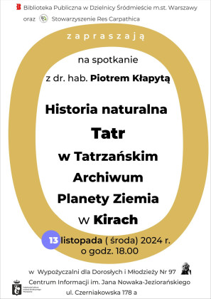 Biblioteka Publiczna w Dzielnicy Śródmieście m.st. Warszawy oraz Stowarzyszenie Res Carpathica zapraszają na spotkanie z dr. hab. Piotrem Kłapytą pt. "Historia naturalna Tatr w Tatrzańskim Archiwum Planety Ziemia w Kirach".