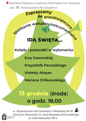 Biblioteka Publiczna w Dzielnicy Śródmieście m.st. Warszawy oraz Stowarzyszenie Res Carpathica zapraszają na przedświąteczne spotkanie wokalno-instrumentalne. Będą kolędy i pastorałki w wykonaniu: