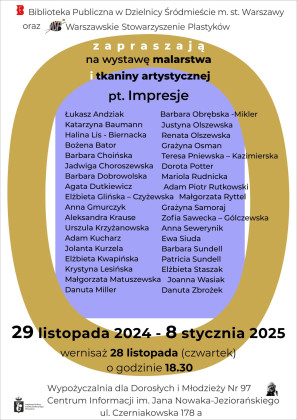Biblioteka Publiczna w Dzielnicy Śródmieście m.st. Warszawy oraz Warszawskie Stowarzyszenie Plastyków zapraszają na wystawę malarstwa i tkaniny artystycznej pt. "Impresje". Wystawa czynna w dniach 29 listopada 2024 - 8 stycznia 2025 w Centrum Informacji im. Jana Nowaka-Jeziorańskiego przy ul. Czerniakowskiej 178a w godzinach 10:00-19:00.