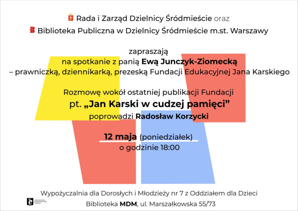 Rada i Zarząd Dzielnicy Śródmieście oraz Biblioteka Publiczna w Dzielnicy Śródmieście m.st. Warszawy zapraszają na spotkanie z panią Ewą Junczyk-Ziomecką – prawniczką, dziennikarką, prezeską Fundacji Edukacyjnej Jana Karskiego.