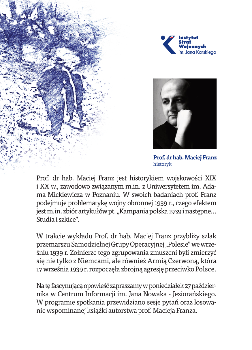 Wykład wygłosi prof. dr. hab. Maciej Franz w dniu 27 października o godzinie 18:00 w Centrum Informacji im. Jana Nowaka Jeziorańskiego przy ulicy Czerniakowskiej 178a.