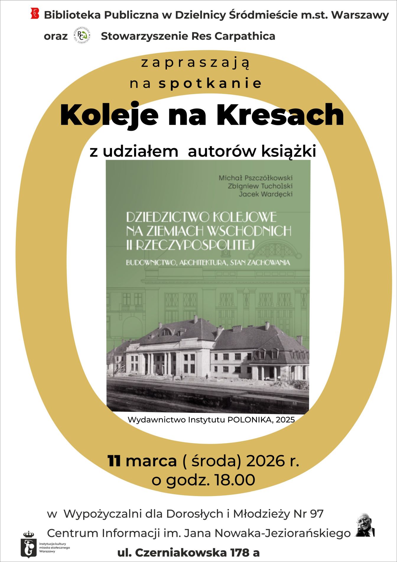 Biblioteka Publiczna w Dzielnicy Śródmieście m.st. Warszawy oraz Stowarzyszenie Res Carpathica zapraszają na spotkanie pt. "Koleje na Kresach" z udziałem autorów książki pt. "Dziedzictwo kolejowe na ziemiach wschodnich II Rzeczypospolitej".