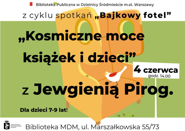 W dniu 4 czerwca o godzinie 14:00 Wypożyczalnia dla Dorosłych i Młodzieży Nr 7 z Oddziałem dla Dzieci (Biblioteka MDM) przy ul. Marszałkowskiej 55/73, zaprasza dzieci w wieku 7-9 lat na spotkanie z cyklu "Bajkowy fotel", "Kosmiczne moce książek i dzieci" z Jewgienią Pirog.