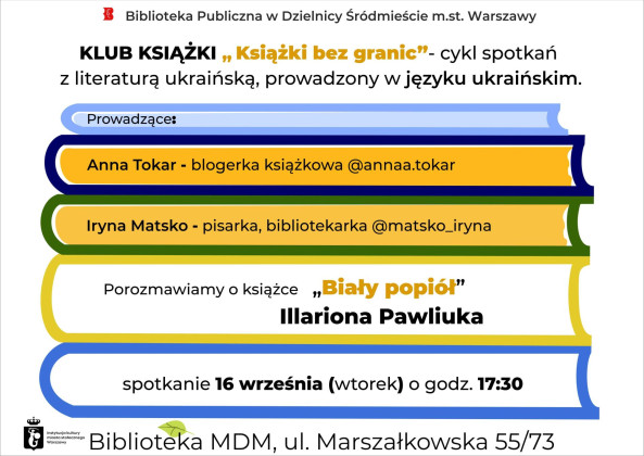 Biblioteka Publiczna w Dzielnicy Śródmieście m.st. Warszawy zaprasza na Klub Książki Ukraińskiej dla dorosłych - cykl spotkań z literaturą ukraińską, prowadzony w języku ukraińskim.