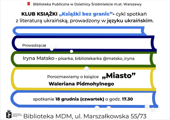 Biblioteka Publiczna w Dzielnicy Śródmieście m.st. Warszawy zaprasza na Klub Książki Ukraińskiej dla dorosłych - cykl spotkań z literaturą ukraińską, prowadzony w języku ukraińskim. Prowadząca: Iryna Matsko - pisarka, bibliotekarka.