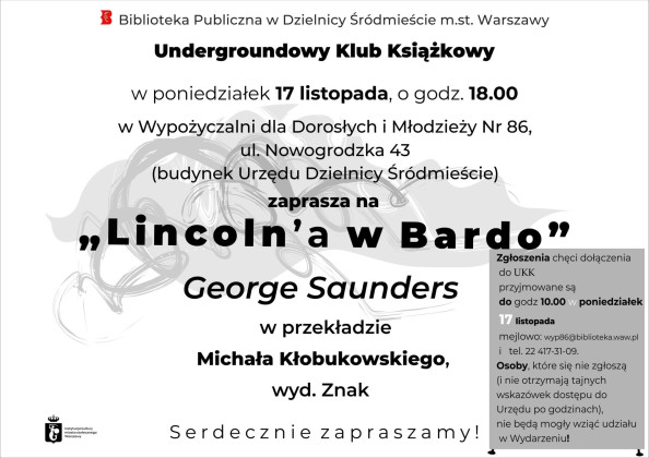 Wypożyczalnia dla Dorosłych i Młodzieży Nr 86, ul. Nowogrodzka 43 (budynek Urzędu Dzielnicy Śródmieście) zaprasza w poniedziałek 17 listopada o godzinie 18:00 na spotkanie Undergroundowego Klubu Książkowego. Porozmawiamy o książce "Lincoln w Bardo" autorstwa George Saunders.