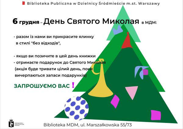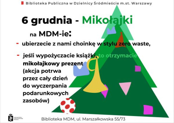 W dniu 6 grudnia Wypożyczalnia dla Dorosłych i Młodzieży nr 7 z Oddziałem dla Dzieci (Biblioteka MDM) przy ul. Marszałkowskiej 55/73, zaprasza dzieci na Mikołajki na MDM-ie: