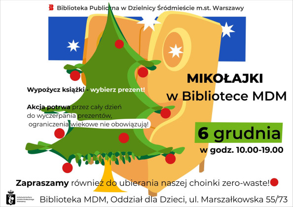 Biblioteka Publiczna w Dzielnicy Śródmieście m.st. Warszawy zaprasza na Mikołajki do Biblioteki MDM przy ul. Marszałkowskiej 55/73. Spotkamy się 6 grudnia w godzinach 10:00-19:00. Wypożycz książki - wybierz prezent. Akcja potrwa przez cały dzień, do wyczerpania prezentów, bez ograniczeń wiekowych.