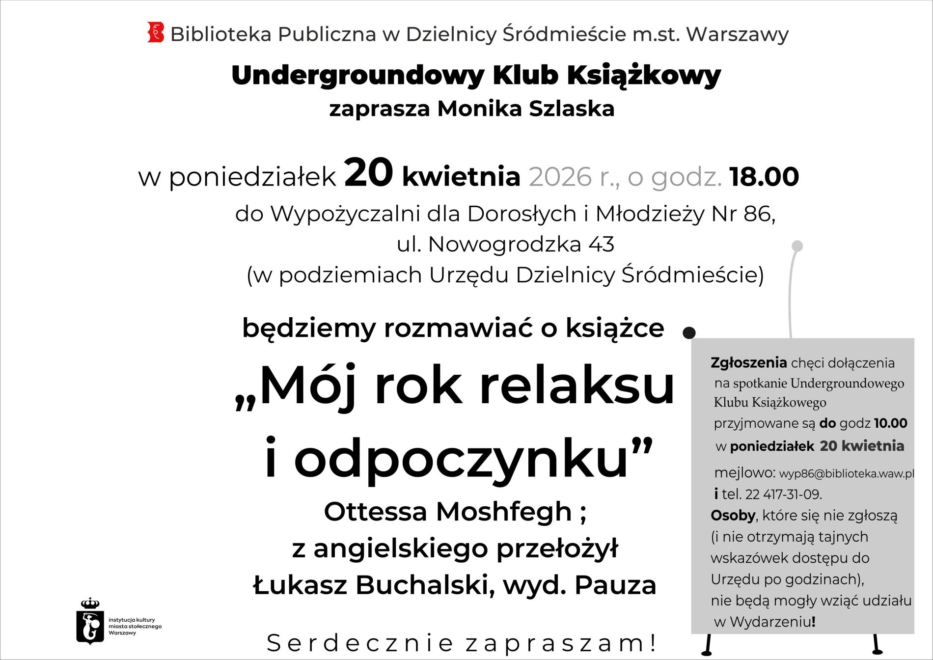 Wypożyczalnia dla Dorosłych i Młodzieży Nr 86, ul. Nowogrodzka 43 (budynek Urzędu Dzielnicy Śródmieście) zaprasza w poniedziałek 20 kwietnia o godzinie 18:00 na spotkanie Undergroundowego Klubu Książkowego. Porozmawiamy o książce "Mój rok relaksu i odpoczynku" - Ottessa Moshfegh.