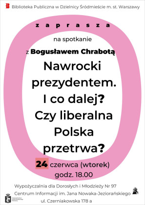 Biblioteka Publiczna w Dzielnicy Śródmieście m.st. Warszawy zaprasza na spotkanie z Bogusławem Chrabotą pt. "Nawrocki prezydentem. I co dalej? Czy liberalna Polska przetrwa?".