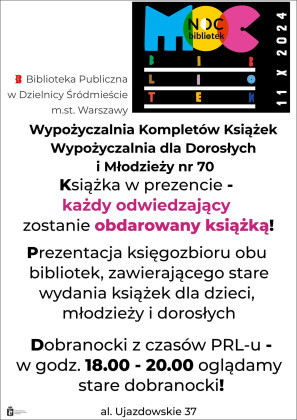 W Noc Bibliotek 11 października, Wypożyczalnia Nr 70 i Wypożyczalnia Kompletów Książek (Al. Ujazdowskie 37) zaprezentuje księgozbiór obu bibliotek, zawierający stare wydania książek dla dzieci, młodzieży i dorosłych. Każdy odwiedzający otrzyma książkę w prezencie.