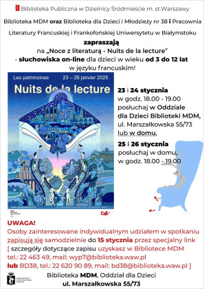 Biblioteka MDM oraz Biblioteka dla Dzieci i Młodzieży Nr 38 i Pracownia Literatury Francuskiej i Frankofońskiej Uniwersytetu w Białymstoku zapraszają na "Noce z literaturą - Nuits de la lecture" - słuchowiska on-line dla dzieci w wieku 3-12 lat w języku francuskim.