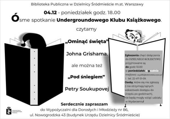 Wypożyczalnia dla Dorosłych i Młodzieży nr 86, ul. Nowogrodzka 43 (budynek Urzędu Dzielnicy Śródmieście) zaprasza w poniedziałek 4 grudnia o godzinie 18:00 na ósme spotkanie Undergroundowego Klubu Książkowego.