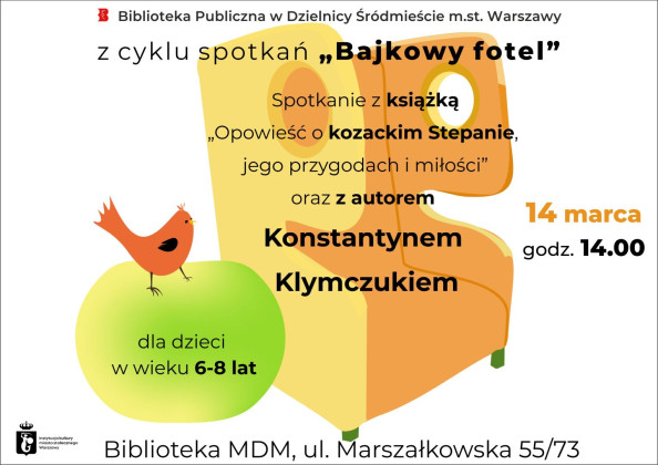 W dniu 14 marca o godzinie 14:00 Wypożyczalnia dla Dorosłych i Młodzieży Nr 7 z Oddziałem dla Dzieci (Biblioteka MDM) przy ul. Marszałkowskiej 55/73, zaprasza dzieci w wieku 6-8 lat na spotkanie z cyklu "Bajkowy fotel". Będzie to spotkanie z książką pt. "Opowieść o kozackim Stepanie, jego przygodach i miłości" oraz z autorem Konstantynem Klymczukiem.