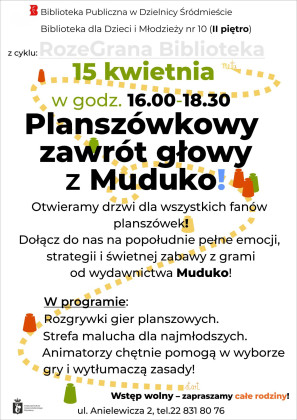 Biblioteka dla Dzieci i Młodzieży Nr 10 (ul. Anielewicza 2) zaprasza 15 kwietnia w godzinach 16:00-18:30 na Planszówkowy zawrót głowy z Muduko.