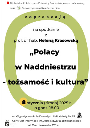 Biblioteka Publiczna w Dzielnicy Śródmieście m.st. Warszawy oraz Stowarzyszenie Res Carpathica zapraszają na spotkanie z prof. dr hab. Heleną Krasowską pt. "Polacy w Naddniestrzu - tożsamość i kultura".