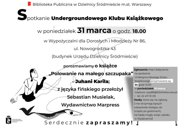 Wypożyczalnia dla Dorosłych i Młodzieży Nr 86, ul. Nowogrodzka 43 (budynek Urzędu Dzielnicy Śródmieście) zaprasza w poniedziałek 31 marca o godzinie 18:00 na spotkanie Undergroundowego Klubu Książkowego. Porozmawiamy o książce "Polowanie na małego szczupaka" - Juhani Karila.