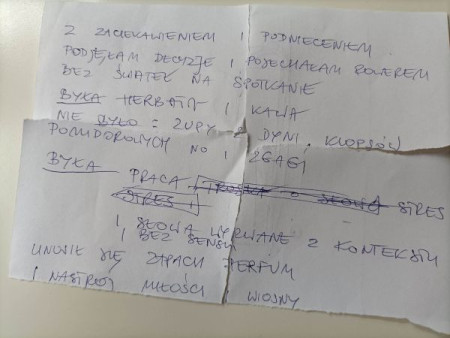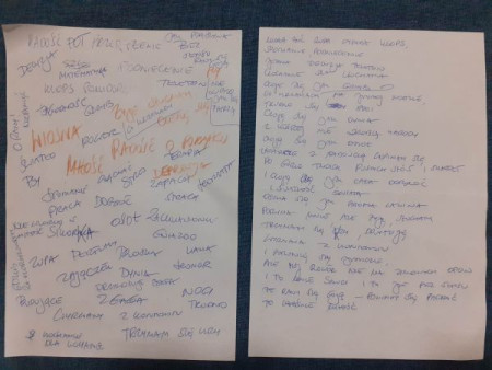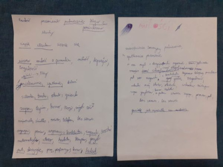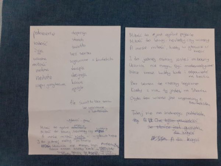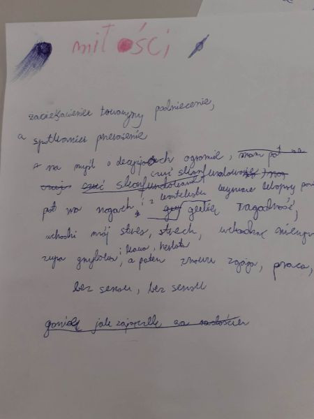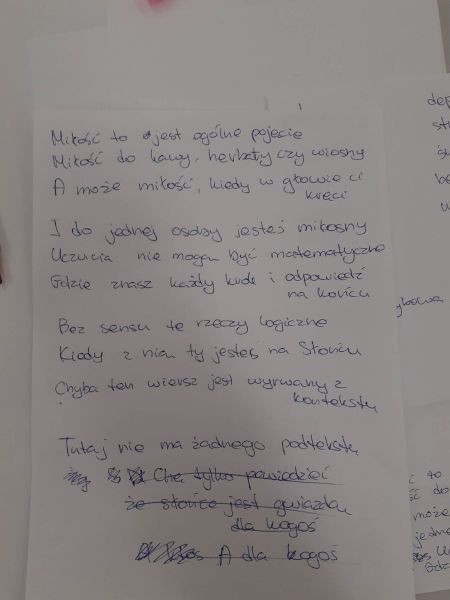 Zeznajemy, że spotkanie było bardzo owocne - każdy uczestnik NIEPRZYMUSZONY stworzył fantastyczny wiersz, chociaż temat był arcytrudny - 'crazy little thing called love' - tak, tak, proszę państwa - pisaliśmy o miłości, wykorzystując ofiarowane sobie wcześniej słowa - inspiracje.
