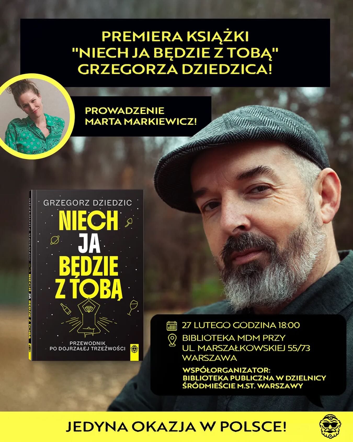 Biblioteka Publiczna w Dzielnicy Śródmieście m.st. Warszawy zaprasza 27 lutego o godzinie 18:00 do Biblioteki MDM (ul. Marszałkowska 55/73) na premierę książki Grzegorza Dziedzica pt. "Niech Ja będzie z Tobą. Przewodnik po dojrzałej trzeźwości".