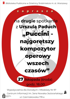 Biblioteka Publiczna w Dzielnicy Śródmieście m.st. Warszawy zaprasza na drugie spotkanie z Urszulą Paduch pt. "Puccini - najgorętszy kompozytor operowy wszech czasów".