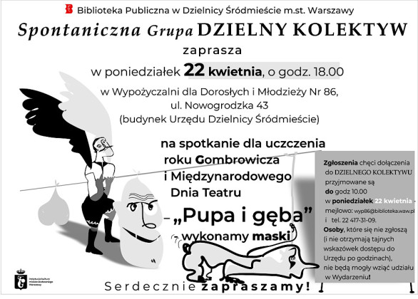 Spontaniczna Grupa DZIELNY KOLEKTYW zaprasza w poniedziałek, 22 kwietnia o godzinie 18:00 do Wypożyczalni dla Dorosłych i Młodzieży Nr 86, ul. Nowogrodzka 43 (budynek Urzędu Dzielnicy Śródmieście) na spotkanie dla uczczenia roku Gombrowicza i Międzynarodowego Dnia Teatru. Wykonamy maski.