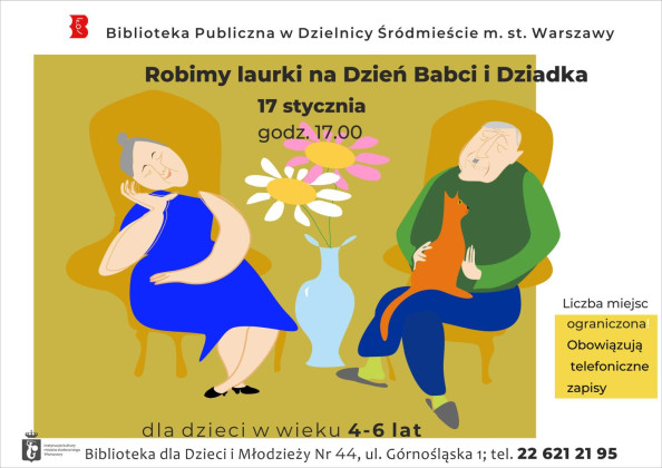 Zapraszamy do Biblioteki nr 44 przy ul. Górnośląskiej 1 na robienie laurek na dzień Babci i Dziadka w dniu 17 stycznia o godzinie 17:00. Ilość miejsc ograniczona, obowiązują zapisy telefoniczne 22 621-21-95.