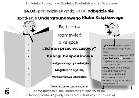 Zgłoszenia chęci dołączenia do Undergroundowego Klubu Książkowego przyjmowane są do godziny 10:00 w poniedziałek 24 lutego - mejlowo: wyp86@biblioteka.waw.pl i telefonicznie: 22 417-31-09.