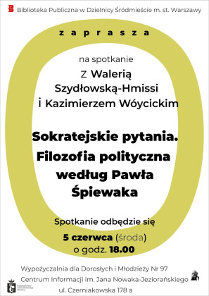 Biblioteka Publiczna w Dzielnicy Śródmieście m.st. Warszawy zaprasza na spotkanie z Walerią Szydłowską-Hmissi i Kazimierzem Wóycickim pt. "Sokratejskie pytania. Filozofia polityczna według Pawła Śpiewaka".