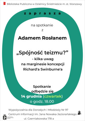 Biblioteka Publiczna w Dzielnicy Śródmieście m.st. Warszawy zaprasza na spotkanie z Adamem Rosłanem pt. "Spójność teizmu? - kilka uwag na marginesie koncepcji Richard'a Swinburne'a".