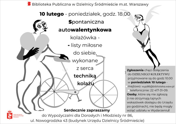 Spontaniczna Grupa DZIELNY KOLEKTYW zaprasza w poniedziałek 10 lutego o godzinie 18:00 do Wypożyczalni dla Dorosłych i Młodzieży Nr 86, ul. Nowogrodzka 43 (budynek Urzędu Dzielnicy Śródmieście) na totalnie, absolutnie i prawdziwie SPONTANICZNĄ AUTOwalentynkową kolażowkę - listy miłosne do siebie wykonane z serca techniką kolażu.